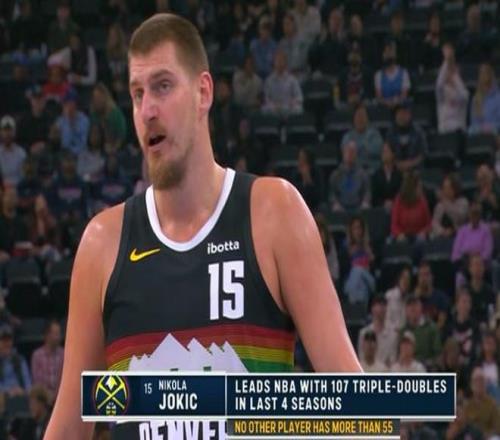比赛期间,转播方给出一组数据:在过去四个赛季中,约基奇共完成了107次三双,而其他球员最多则不超过55次三双。 据NBA数据网站StatMuse统计,过去四个赛季,约基奇实际拿到了109次三双(包括常规赛和季后赛),第二名萨博尼斯仅拿到了50次,不足约基奇的一半。