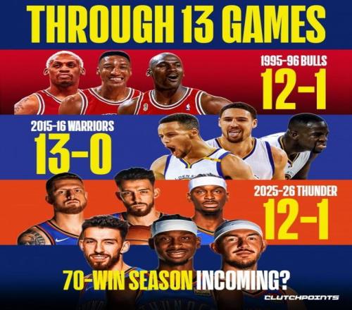 开赛13场后,雷霆以12胜1负的战绩追平了96公牛的同期纪录,OKC在13场比赛中净胜对手202分。本赛季,雷霆有望在常规赛冲击70+的胜场数。 数据显示,雷霆上赛季常规赛场均净胜对手12.8分,而本赛季至今,他们场均净胜分达到+15.5分。看来,雷霆本赛季的表现甚至比上赛季同期还要强势。OKC众将对于胜利的渴望,远胜从前。对于卫冕冠军而言,能够阻止雷霆再次夺冠的只有自身的懈怠。然而,雷霆众将士却专注于赢下每场比赛,这展示了他们再次冲击总冠军的坚定决心。 雷霆开赛季取得12胜1负的佳绩