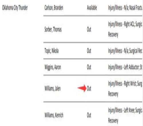 威廉姆斯在休赛期接受了右手腕完全撕裂的舟月韧带修复手术——上赛季雷霆队夺冠征程中,他一直带伤作战。10月末,他再次接受手腕后续手术,移除了康复过程中引发不适的一枚螺钉,自此便未登场过。 不过,威廉姆斯的休战已为雷霆队节省了下赛季的薪资空间。 今年7月,威廉姆斯与雷霆队签下一份为期五年的新秀顶薪续约合同,若能达成最佳阵容等激励条款,合同总额最高可达2.87亿美元。若达不到,就是5年2.41亿。