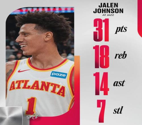 11月份,杰伦-约翰逊成为整个联盟状态最火热的球员之一。 上周他场均24分12篮板9.3助攻2.5抢断率队取得4连胜,凭借优异的表现生涯首次当选周最佳。 其中对阵爵士的比赛,他在上半场便12投7中、三分3中3轰下20分5篮板8助攻5抢断,成为NBA历史上首位半场至少拿到20分5篮板5助攻5抢断的球员。 那场比赛,他的数据最终定格在31分18篮板14助攻7抢断,四项数据全部创造生涯新高,他也成为NBA历史上首位单场至少砍下31分18篮板14助攻7抢断的球员。