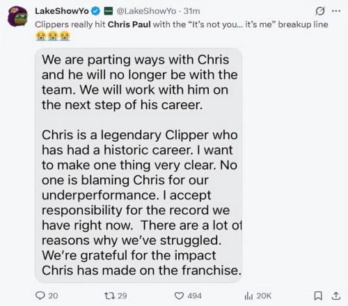 快船记者Joey Linn写道:NBA是商业联赛,有些决策不需要带有个人情噶,快船队史甚至还没有退役过球衣,格里芬、保罗都是快船队史最出色的球员,他们都明确表态愿意在快船退役,可快船管理层都对他们进行了清理,交易格里芬,裁掉保罗,我无法认同快船的行为,他们对两位球队代言人的道别非常糟糕。