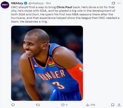 雷霆记者:保罗曾在OKC度过了很美好的赛季,雷霆队本赛季高居联盟第一,我们应该召回保罗让他拿到一枚总冠军戒指退役。 |