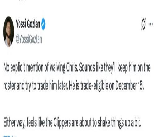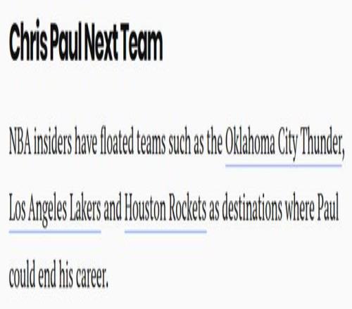薪金专家戈兹兰指出,快船在官宣这一劲爆消息的声明中,并未提及“裁掉保罗”的相关表述。“声明里没明确说要裁克里斯,听着像是他们会先把他留在阵容名单里,之后再尝试交易。他12月16日就能被交易了。不管怎样,快船这是要开始搞点大变动了。” NBA圈内人士已列出多支可能成为保罗生涯终点站的球队,包括俄克拉荷马城雷霆、洛杉矶湖人和休斯顿火箭。