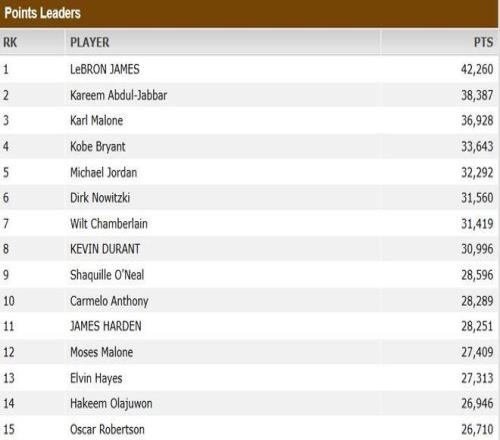 杰伦-布朗在直播中谈到了自己拿到12000分的感受,布朗说道:“我就坐在这里想,勒布朗到底是怎么拿到42000分的?” 截至目前,詹姆斯以42260分排名NBA历史总得分榜第一位,杜兰特是现役球员得分第二名,目前得到了30996分。