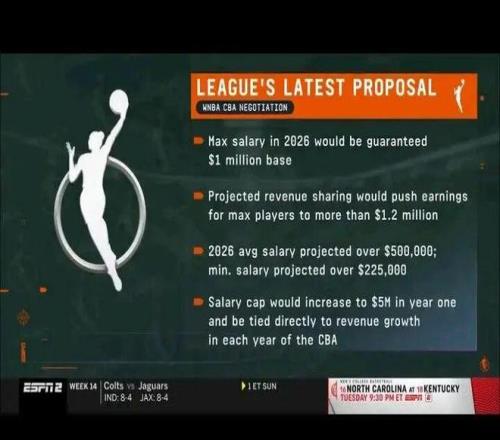 那么,WNBA的劳资谈判,为何走到了这一步? 问题的根源,是在一个高速发展的联盟中出现了一个主要矛盾——球员日益增长的薪资需求同落后的分配机制之间的矛盾。 之前在WNBA总决赛之后,体育产业生态圈曾撰文表示WNBA正在经历,即联盟欣欣向荣的收视率、上座人数、赞助商都在增长,但并没有转化到社媒上讨论与关注度的质变。 这种感觉不假,但互联网一直在给我们的上的一课便是,相比互联网上的「火」,更重要的是真金白银。 对于WNBA而言,这些真金白银来自实打实的数据。2025赛季,WNBA的平均上座人数达到10,986人,创下历史新高。ESPN公布的数据显示,场均收视人数为130万,是自联盟成立以来的最佳表现。 赞助收入上,据《SportsPro》数据显示,联盟及各队目前共有531份商业合作协议,平均每支球队拥有44个合作伙伴,比2022年增长52%。 营收数字也同样漂亮。2019年,联盟总收入仅略高于1亿美元;到2023年,已提升至约2亿美元区间。随着两支扩军球队的加盟费,以及即将生效的十一年22亿美元转播合同,WNBA的现金流在未来几年都将维持增长——女子体育整体上扬的大背景下,WNBA未来上涨曲线只会更加好看。 因此,球员自然也有底气喊出:联盟赚得更多,我们也理应共享这份成长红利。 但问题在于,现行的分配机制并不支持这种增长共享。根据现有劳资协议,WNBA球员的总薪资占联盟收入的比例约为9.3%。联盟实行的是一种「触发式分成」:只有当联盟连续多个赛季每年营收增长20%,才会启动收入分成机制。触发之后,联盟会先扣除30%的运营成本,再将剩余70%与球员平分。 听上去复杂,但这个机制从未被触发过。因为疫情让2020、2021赛季的营收严重缩水,联盟至今没能弥补差距。 结果是,即使目前的营收增长超过150%,球员拿到的分成依然不到10%。 于是,工会提出核心诉求:要建立一个与联盟收入直接挂钩的分成体系。比例不必与NBA持平,但要有实际增长空间——据多方报道,工会提出的目标是30%左右。 用球员工会副主席凯尔西·普拉姆的话来说,第一、第二、第三优先都是分成与薪资:「如果我们连去哪个餐厅都没定,讨论点什么菜有什么用?」 在上周最新一份提案中,联盟提出的最新方案以大幅涨薪为核心:标准顶薪为100万美元,通过收入分成机制最高可达120万美元;平均年薪大约为50万美元,最低年薪则在22万左右。这些数字,远远高于目前的水平。现在WNBA的底薪、平均薪资和顶薪分别为:6.6万美元10.22万美元、和24.9万美元。