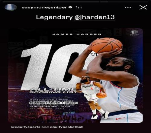 本场比赛,快船球星詹姆斯-哈登惨遭“里程悲”,他通过本场比赛完成对卡梅隆-安东尼的超越,正式升至NBA历史总得分榜的第十位。 在哈登完成这一成就后,哈登的前队友、目前效力于火箭队的杜兰特发布个人社媒,晒出哈登的里程碑海报为其庆祝,他配文写道“传奇哈登”。随后哈登也在社媒上回复了杜兰特,并写道:“哎,告诉詹姆斯(总得分榜第一)我们可在前十榜单中了啊。你们俩都与众不同!”
