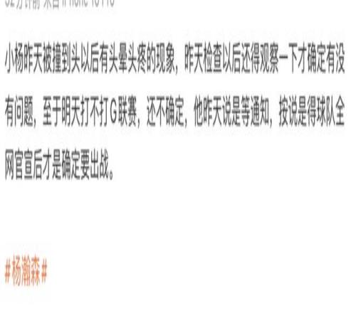 如今我嘞个胡豆er透露:“小杨昨天被撞到头以后,有头晕头疼的现象,昨天检查以后还得观察一下,才确定有没有问题。至于明天打不打G联赛,还不确定,他昨天说是等通知,按说是得球队全网官宣后才是确定要出战。”
