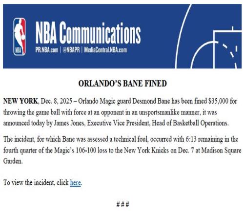 北京时间12月9日,NBA官方公布罚单,魔术后卫贝恩被罚款35000美元。NBA篮球运营执行副总裁詹姆斯-琼斯今日正式宣布,贝恩因以非体育道德行为用力将比赛用球砸向对手(阿奴诺比),被处以35000美元罚款。