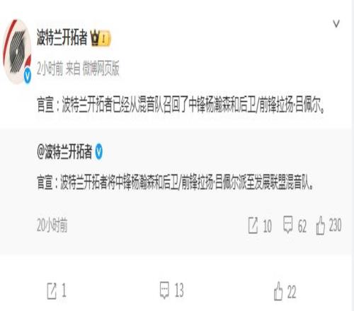 杨瀚森在比赛最后时刻贡献关键暴扣与制胜篮板,帮助撕裂之城混音主场116-110战胜斯托克顿国王,成为球队取胜的重要功臣。 如今开拓者官方宣布,将杨瀚森与吕佩尔从发展联盟召回。只是开拓者下一场比赛是12月19日主场对阵国王,因而根据开拓者跟队记者Casey补充报道,他预计杨瀚森和吕佩尔在跟随开拓者完成周二(美国时间)的训练后,会被再次被下放。