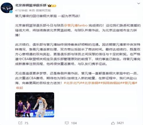 官方:北京北汽正式续约曾凡博续约延迟因曾凡博近期家中有事