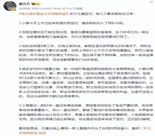 北京首钢官宣曾凡博回归!3年B类合同,多方辟谣千万年薪