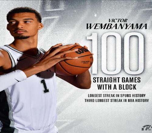 文班亚马连续100场比赛送出封盖创造马刺队史纪录