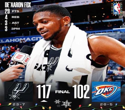 圣诞大战,马刺客场117-102战胜雷霆。 是的,这已经是马刺本赛季第三次击败雷霆了,这三场比赛全部发生在过去的半个月时间,而且一场比一场干脆残暴: ——两队第一次交手在NBA杯半决赛,那场马刺最多落后16分,文班亚马替补成为奇兵(只打了20分钟,拿了22分9篮板2助攻,正负值+21),马刺111-109险胜雷霆2分