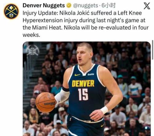 昨日深夜,名记Shams公布了一条让人松了一口气的消息: 约基奇,左膝过度伸展,没有结构性损伤,四周后重新评估伤情。