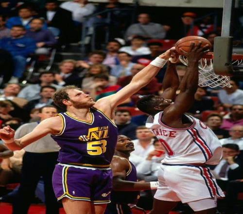 “猛犸象”马克-伊顿是1982年第四轮第三顺位,他身高2.24米,是一名防守型球员。伊顿在NBA打了11个赛季全部效力于爵士,除了最后一个赛季出战64场外,他出战最少的一个赛季也有79场,其中五个赛季打满82场常规赛,对于一个224cm的巨人来说这是非常难得的。伊顿曾两次荣膺最佳防守球员,三次入选一防,他还入选过一次全明星,斩获了四个盖帽王。生涯出战常规赛875场,场均6分7.9篮板,投篮命中率为45.8%,共送出3064次盖帽,排在历史第四位,他也是贾巴尔之后第一个盖帽总数超过3000的球员,他生涯场均盖帽3.5次,位列历史第二。 马努特-波尔