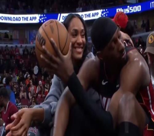 前方消息称,球馆地板下的冰面已出现融化现象,馆内湿度更是达到了日常水平的近两倍。趁着场上队友都在进行热身投篮,热火球星阿德巴约与专程来观战的女友、WNBA巨星阿贾-威尔逊在场边亲密互动,大秀恩爱,似乎完全没有受到比赛延期的影响。 |