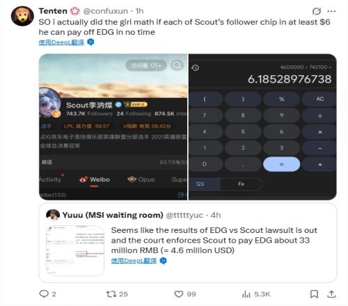 网友整活:Scout粉丝每人至少出6美元,很快就能还清欠EDG的钱了