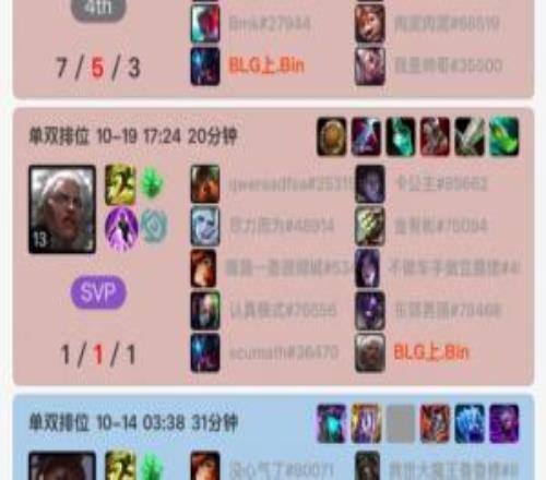 电竞新闻10月19日讯 BLG上单Bin自14号凌晨后在今天再度开启韩服Rank,使用一把挖掘机(7-5-3),一把狼母(1-1-1),两把全负。 |