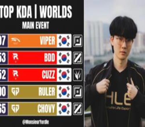 电竞新闻11月10日讯 今日外媒统计S15 KDA排行榜,具体如下: Viper 8.07 Bdd 6.53 Cuzz 6.52 Ruler 6 Chovy 5.65 |