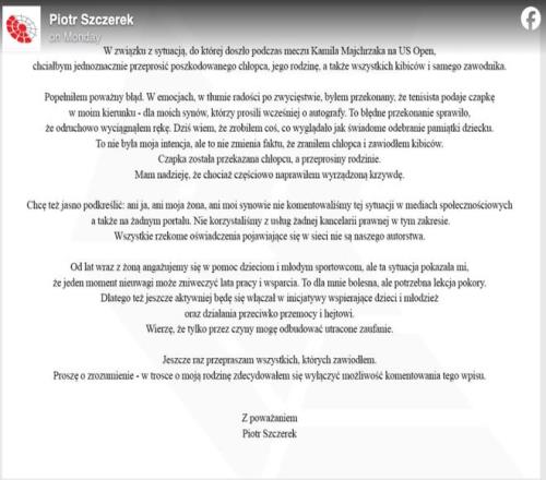 网球赛场上,镜头往往追随的是挥拍击球的明星运动员,然而在今年的美网现场,观众席间的一顶小小帽子,却意外成了主角。 8月28日,纽约法拉盛,正值美国网球公开赛第二轮。球迷们情绪高涨,因为波兰选手Kamil Majchrzak爆冷击败了名将Karen Khachanov。就在全场为胜利欢呼的时候,一场出人意料的插曲发生了——而且发生在观众席。 按照惯例,球员会在赛后签名,与观众互动。Majchrzak显然心情不错,他脱下了自己头上的帽子,准备送给一直为他加油的球迷们。 镜头捕捉到的画面令人动容:Majchrzak先是在网球上签下名字,而后摘掉帽子,径直递给在他正前方观众席上的白衣服男孩。小男孩兴奋地伸手,差一点就能触碰到偶像的礼物。 然而,接下来的一幕,却让人目瞪口呆。就在小男孩几乎触到帽子的瞬间,旁边的一位身穿运动装的中年男子突然伸手,迅速把帽子抢了过去。 他的脸上挂着得意的笑容,还不忘把“战利品”塞进他太太的包里。 小男孩先是被“半路杀出”的手吓了一跳,但他没退缩,而是勇敢地伸手,试图拿回帽子。周围一阵惊呼,还有人当场喊:“Give it to the kid!(还给孩子!)”但都无济于事,小男孩只能失落地垂下手,搭在栏杆上。 这一切都被高清摄像机完整记录,并通过转播画面传遍全球。 这样“欺负小孩”的画面,自然引爆了网络。推特、TikTok、Instagram上瞬间刷屏。 网友们展开了全民人肉搜索,仅仅几分钟,这位“夺帽男”的身份就被扒了个底朝天。 他叫Piotr Szczerek,波兰一家大型铺路公司Drogbruk的CEO,身价不菲,是个货真价实的百万富翁。 于是,剧情立刻升级:一个小孩子和一顶帽子的故事,被放大成了“资本家在公众场合抢夺孩子的快乐”。舆论场上,骂声像潮水一样涌来——“冷血”、“贪婪”、“脸皮厚”、“有钱就可以抢东西吗?” 面对铺天盖地的愤怒,Piotr Szczerek很快把自己的社交媒体设为私密。但这一步显然太晚了,成千上万条辱骂和威胁已经涌入。 就在舆论最激烈的时候,一个更加火上浇油的声明在网络流传开来。 据说是Piotr本人在波兰论坛GoWork上的留言,他写道: “是的,我拿了,是的,我动作快。但就像我一直说的,人生就是这样,先到先得。” 这番话被媒体疯狂转载,直接把愤怒的火焰推到顶点。网友们怒斥他毫无悔意,还把他和“霸凌者”、“投机者”挂钩。 然而,这份声明的真实性很快被质疑。因为Piotr关闭了所有账号,外界根本无法确认这是否真出自他本人。甚至有媒体指出,这可能是某些Reddit用户的伪造。 真假难辨,但对他的舆论形象来说,几乎没有区别——在互联网的法庭上,他已经被定罪。 事态持续发酵,另一位的当事人、网球选手Majchrzak也忍不住了。他通过社交媒体发声,希望大家能帮他找到那个小男孩。 不久之后,信息传开,小男孩的身份被确认——他叫Brock。 事情迎来了转机。Majchrzak在社交媒体上分享了一段限时动态(虽然现在已经看不到了),画面里,他和Brock终于见面了。 为了弥补那天的遗憾,他不仅亲手把一顶帽子送给了小粉丝,还准备了各种礼物,满满一桌子,把小男孩“淹没”在惊喜里。 Brock的笑容,为这场令人愤怒的插曲加入美妙音符。 就在舆论汹涌到顶点后,Piotr Szczerek终于在9月1日通过官方账号发表了道歉声明。他强调,这是自己第一次也是唯一一次公开发声,之前那个“先到先得”的发言并不是他写的。 在声明中,他态度严肃而郑重: “我要毫无保留地向那个小男孩、他的家人、球迷以及球员本人道歉。我犯下了一个巨大的错误。在人群的欢呼声和胜利的氛围里,我以为球员是把帽子递给我的孩子们。是的,我的动作看起来就像故意从孩子手里抢走了一样,但那并不是我的本意。” 他承认,自己的行为让孩子伤心,也让粉丝们愤怒失望。“这不是我的本意,但事实已经发生,我必须承担后果。” 声明一出,算是给事件画上了一个阶段性的句号。 短短几天时间,百万富翁CEO从“成功人士”变成“全球公敌”,只因为一顶帽子。他或许没想到,自己一个下意识的举动,会在高清镜头和全球直播面前,变成社交媒体的“全民公审”。 也许他真的只是一时手快,但抢走帽子是无可争辩的事实,在互联网的放大效应下,几乎没有人为他辩护的空间。 最终,这顶帽子回到了小男孩手里,但Piotr Szczerek付出的代价,是形象的彻底崩塌。 Ref: https://www.huffingtonpost.fr/sport/article/a-l-us-open-un-pdg-pique-le-cadeau-d-un-enfant-et-outre-internet_254238.html 文|小月 点「赞」「在看」为我们打call ▽ |