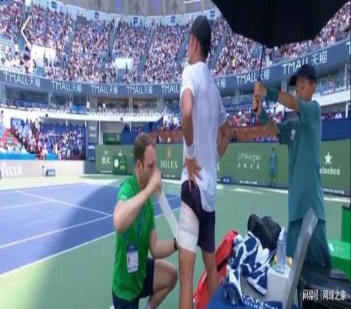 第十一局吴易昺在救一个小球时,可能是用力过猛拉伤了左大腿,进入局休后中国一哥就叫了医疗暂停。