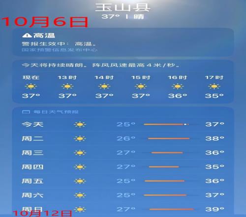 来势也很迅猛。 玉山县可能在本周末达到39度。