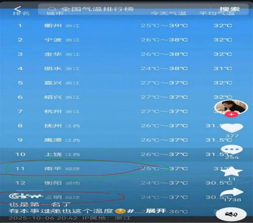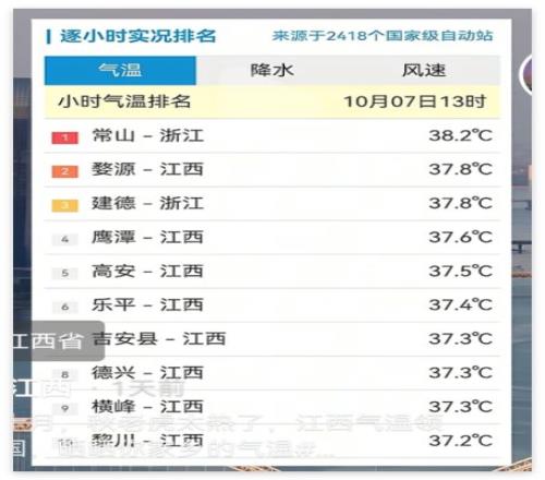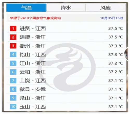 这些图的纷至沓来也让我们知道,与浙江争得不可开交的省份叫江西。 全国气温排行榜上的城市基本都是他俩的。 10月5日,江西4个城市进过;