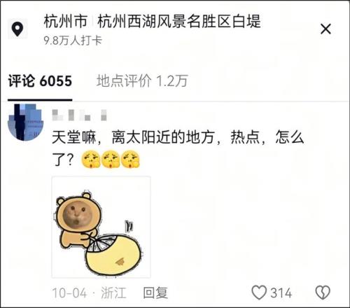 主城区更是高达37.1℃,霸气打破三个历史纪录——全年高温日数纪录、最晚高温纪录以及史上最热中秋节纪录。 没有对比就没有伤害,位于热带的海南三亚都没有杭州热,可这不就是天堂的本意吗?
