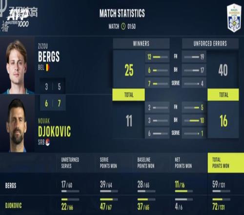 10月9日,ATP1000上海大师赛1/4决赛进行。赛会4号种子德约科维奇出战,对手是比利时选手贝尔赫斯。经过1小时51分钟的鏖战,德约科维奇直落两盘6-3/7-5击败对手,成功闯入上海大师赛四强。 这是德约职业生涯第80次闯入大师赛四强,他还以38岁4个月的年龄,打破了自己所保持的最年长大师赛四强纪录。接下来的半决赛,德约将同资格赛突围的黑马瓦舍罗隔网相对。 当然,在旗忠网球中心,老将的传奇,还不仅仅是德约。中国球迷另一位挚爱,也是德约在网坛多年的老对手费德勒明晚也将亮相,携手甄子丹、吴磊、郑洁送上“超级挚友之夜”,五星体育全平台将于明晚(10月10日)19:20开始直播,详细信息可点击: 回到今晚的比赛,德约科维奇目前排名世界第5位,贝尔赫斯排名第44位。双方在此前从未有过交手记录,此番是两人的首次碰面。 本场比赛首盘德约科维奇在第6局率先破发,取得了4-2的领先优势。第7局比赛德约挽救3个破发点保发,5-2领先贝尔赫斯。第8局贝尔赫斯0-40落后的情况下连打3个ACE发球,并在挽救了5个盘点后完成保发,不过随后德约在第9局保下发球胜盘局,6-3赢下了第一盘比赛。 第二盘双方在前8局各保发球局,第9局比赛德约科维奇完成关键破发,5-4领先进入发球胜赛局。然而德约没能把握住机会遭到回破,双方5-5再次回到均势。此时的德约疲态尽显,不止一次地双手撑在膝盖上大口喘气。 不过,德约的“残血”状态,恰恰激活了他愈战愈勇的模式。第11局德约再次破发,6-5领先迎来又一个发球胜赛局。第12局德约40-30拿到赛点,却被贝尔赫斯连拿2分逼出破发点。只见德天王先是一记发球直接得分,再等来了对手两个非受迫性失误,稳稳收下赛点,晋级半决赛。 比赛结束后的第一时间,德约科维奇又在镜头上秀起了自己的中文,一个大大的“福”字送给了所有观众。这也不奇怪,这已经是德约在上海大师赛第10次晋级半决赛,仅次于他在罗马的13次,说上海是他的福地也不为过。 接受采访时的德约更是表现得精疲力尽。事实上,两天前那场高温下的比赛几乎已经榨干了他的体力。但老将自有老将的办法,本场比赛最后一个发球胜盘局几乎就是全场的缩影,德约极少主动得分,更多时间是不紧不慢地与贝尔赫斯对峙,等待对手自己出现失误。整场比赛,贝尔赫斯虽然轰出了25个制胜分,但非受迫性失误来到了40次,几乎是德约的3倍。于是,38岁老将靠着经验闯入四强,离连续打进上海大师赛的决赛又进了一步。 |