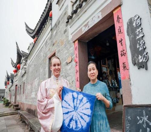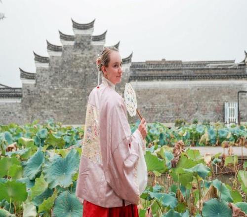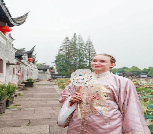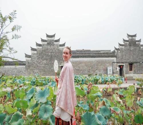 一颦一笑皆风景,莱巴金娜身穿汉服漫步宁波走马塘村