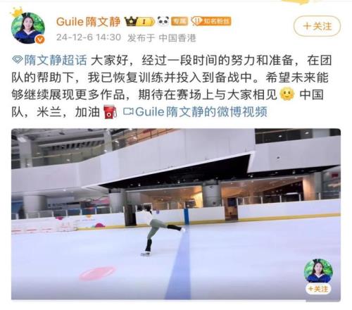 隋文静以辅助教练身份在花滑比赛现场(图源:新京报) 回归之路不简单 2024年12月,隋文静率先通过微博发声“经过一段时间的努力和准备,已恢复训练投入备战,中国队,米兰,加油”,正式宣告回归,视频中她跳跃稳健、滑行流畅,状态极佳。复出初期,隋文静曾与多位男选手搭档训练,磨合技术衔接。
