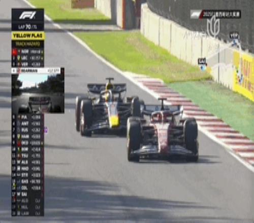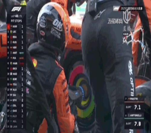 第48圈,安东内利、皮亚斯特里和汉密尔顿同圈进站,在维修区中,皮亚斯特里完成了对安东内利的超越升至第7。随后一圈,拉塞尔和比尔曼也选择进站!一停的比赛竟然变成了两停?!