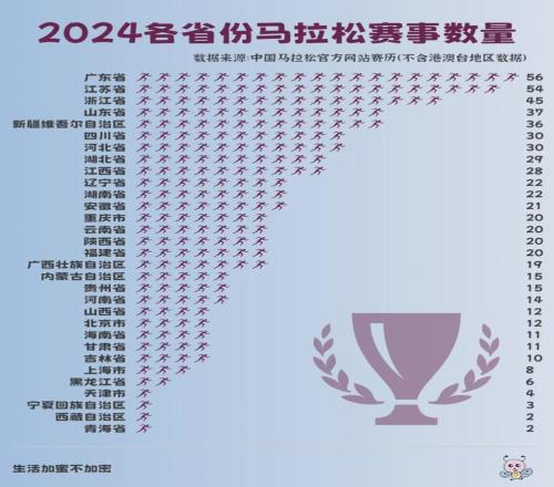 哪些地方最热衷办马拉松赛呢? 以2024年为例,广东、江苏、浙江、山东、新疆、四川、河北的年赛事数量超过了30场。 一半以上的省份,年办赛超过20场。