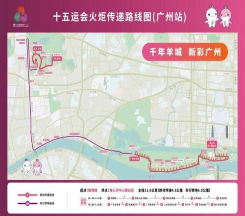 广州 广州站火炬传递路线以“千年羊城 新彩广州”为主题,从传统中轴迈向新中轴,从城市起源图腾(五羊石像)到近代历史印记(海珠广场),从体育冠军摇篮(广东省二沙体育训练中心)到城市客厅(海心沙中心舞台),串联历史地标与现代风貌,展开一段从古代文明到近代革命、再到现代都市的历史叙事,展现“老城市新活力”的传承与创新,彰显广州在融湾向海的中国式现代化进程中排头兵、领头羊和火车头的使命担当。整个火炬传递路线共11.6公里,其中跑动传递4.8公里,无人驾驶车辆转场6.8公里。