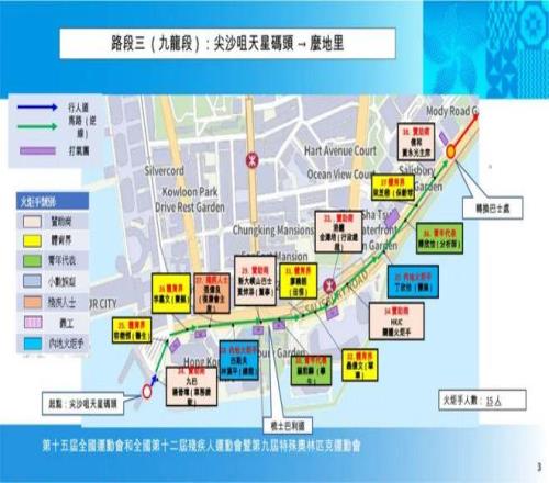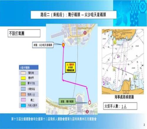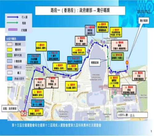 四个城市火炬传递路线 究竟如何 一起抢先看 香港 香港站的火炬传递于11月2日上午9时30分开始,路线全长约10公里,共分为五段,其中跑步距离约占3.8公里。香港段以添马政府总部为起点,途经中西区海滨长廊(中环段)、湾仔临时海滨花园、香港回归祖国纪念碑和金紫荆广场。 第二段火炬手会乘坐天星小轮横渡维多利亚港,然后进入第三段尖沙咀段,由尖沙咀天星码头巴士总站经梳士巴利道至么地里,途经香港文化中心和香港艺术馆。 第四段火炬手乘坐开篷巴士至香港启德体育园巴士站;进入第五段启德体育园范围,途经青年运动场,进入启德体育大道至启德体育园中央广场,由最后一名火炬手点燃火盆,并进行收火仪式。