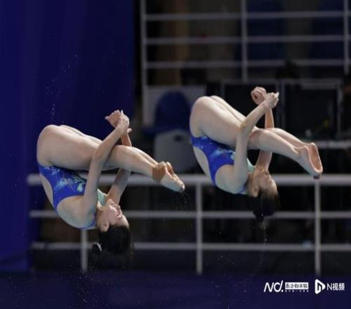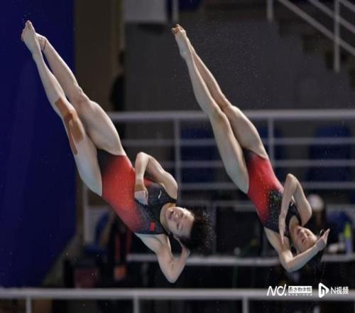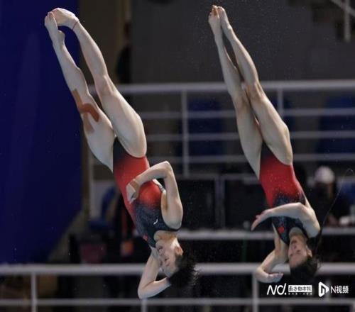 陈艺文/林珊在比赛中。 奥运冠军陈艺文和队友林珊每跳均列第一,三跳过后以总分225.63分排名第一,广东另一对组合梅颖芯/欧阳钰以总分203.40分排名第三,四川队的陈佳/杨睿琳以总分211.05分排名第二。