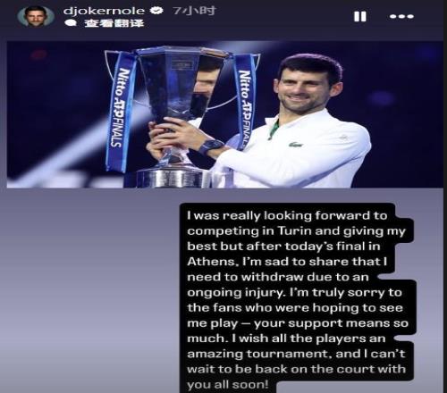 我真的希望能以一个最好的状态去都灵参加年终总决赛,但在今天雅典的比赛后,我很遗憾地宣布我将因伤退赛。对于想来看我比赛的粉丝们,我感到非常抱歉,你们的支持对我来说意味着一切。我希望所有参赛者可以打出一站精彩的比赛,同时我也期待着尽快重返赛场! (社媒完) 在2023年夺得年终总决赛冠军后,德约科维奇已经连续两年退出年终总决赛。因为德约退赛,目前积分排在第9的穆塞蒂也取得了年终总决赛的参赛资格。 |