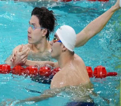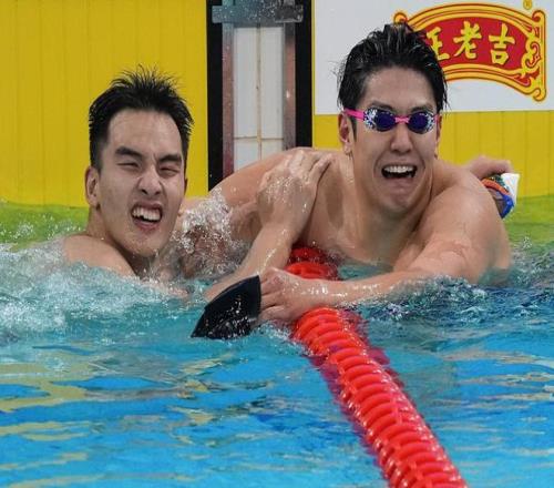 11月13日,上海队选手郑英昊(左)与江苏队选手董志豪在比赛后。郑英昊获得冠军,董志豪获得第四名。 郑英昊的十五运征程还将继续,但对于他而言已然一鸣惊人,值得一提的是,郑英昊并非初出茅庐,其实早在2019年青运会就曾大放异彩,年仅16岁的他一口气拿下4枚金牌,当时他和唐钱婷两位小将在业内被大家一致看好,有望成为未来的“蛙王”和“蛙后”。 唐钱婷的故事大家都了然于胸,她成绩一路飙升,成为中国女子蛙泳项目上的领军人物,并且在巴黎奥运会上拿下了女子100米蛙泳银牌,而郑英昊这一路走得就不那么顺畅了。2021年西安全运会之前,郑英昊被寄予厚望,他自己也渴望在这个更大的舞台上有所斩获,然而,因为状态波动,这位小将最终并没有获得理想的成绩。