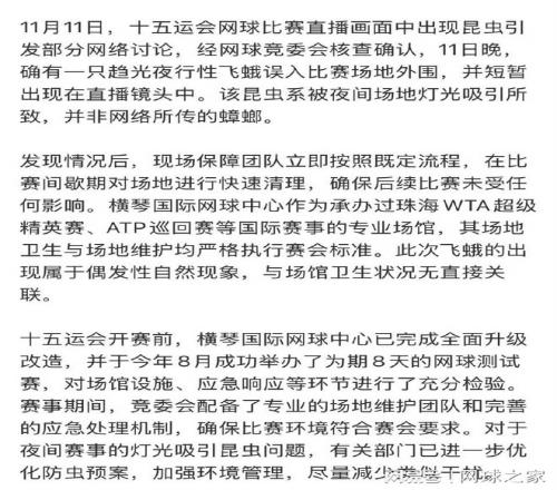 然而,在全民玩梗的背后,质疑的声音也随即而来,“全运会场馆卫生”的话题迅速登上热搜榜。 “在这么高级的赛事场馆里看到蟑螂,确实让人意外。”一位体育博主在微博上写道,"这让人不禁要问:‘场馆的日常清洁工作是否到位?’”类似的质疑声在网络上此起彼伏,更多人开始担忧这是否会影响比赛的正常进行。 在事件发生24小时后,全运会网球竞赛委员会于9月13日晚间正式发布情况说明。这份通过官方渠道发布的声明显示:“经网球竞委会核查确认,12日晚,确有一只趋光夜行性飞蛾误入比赛场地外围,该昆虫在场地内短暂停留后即飞离,并未对比赛造成实际影响。”