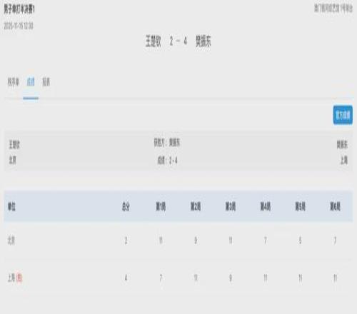 11月15日,第十五届全国运动会乒乓球男子单打半决赛在澳门银河综艺馆进行。王楚钦、樊振东两位奥运冠军正面交锋。 前3局樊振东两度落后两度扳平,第6局,樊振东0比4开局,之后连得6分取得6比4领先。最终,樊振东以4:2取胜,晋级男单决赛,六局比分为7-11,11-9,9-11,11-7,11-5,11-7。
