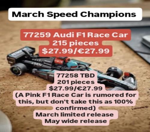 已知套装参数: 零件数:215 海外售价:27.99美元 发售日期:2026年3月1日 77258 未知粉色F1赛车(待定)