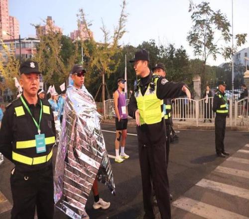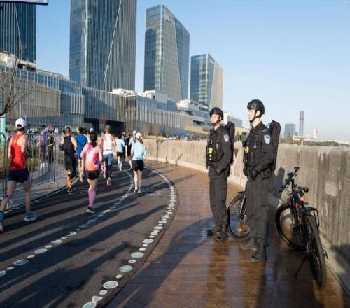 在起点宝山体育场,宝山公安分局治安管理支队根据6000名参赛人员出发组顺序,科学设置A、B、C三处更衣区和前往出发区的动线,并沿途安排人员、设置标识引导参赛人员前往自己的更衣大巴区和出发区域等待,用物理隔断确保现场人流始终有序。在宝钢体育场终点线处设置专门警力,确保参赛人员最终冲刺阶段始终为“真空”状态,防止意外事件发生。在路线经过炮台湾湿地公园、邮轮港、滨江步道等风景点位时,治安管理支队增设警力对沿途的“黑飞”无人机进行发现处置,并配备无人机反制枪及时进行处理。