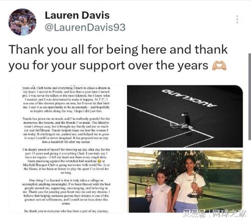戴维斯,这位网坛的矮个子巨人,最终以退役的方式,完成了她最有力的一次发球——不是飞向对方场区,而是直击我们关于天赋、条件与成功的固化思维。在她离开的那一刻,我们才恍然发现,原来最动人的网球,不一定来自最高的选手;最精彩的人生,不一定符合最标准的模板。(来源:网球之家 作者:小迪)