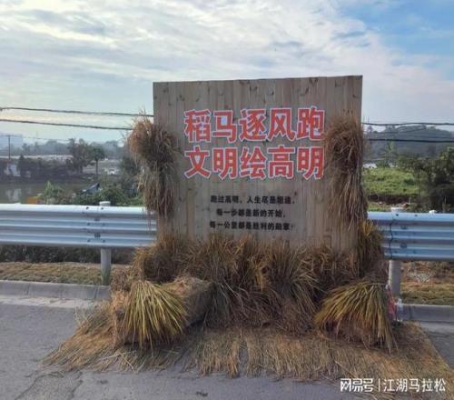 后来了解到,因为跑进稻田的路比较窄,基于安全以及选手良好体验考虑,半马就没有硬往稻田上凑了。比较有趣的是,15K后全半马分道,最后几公里的赛道旁,隔几百米就有一个用稻草堆积的加油点,多少也算是让我跟稻田有过“接触”了。 高明稻田马今年是第三届,能够在“风浪”中存活,充分表明了主办方对赛事的鼎力支持。高明是佛山的一个区,这样的县区级赛事,不宜大而全,更适合主打特色,一样能办出品牌,吸引跑者。 也是来到高明才知道,有400年历史的海天酱油是这里的。海天大道上浓浓的酱油味,让高明稻田马变得有滋有味。参赛包里,海天产品一瓶一瓶又一瓶,不只酱油,还有花生油、矿泉水。 不管参赛包,还是完赛包,分量都很足。参赛包有包1KG的万占香米压阵,完赛包有大毛巾、葛粉煎饼等。而从赛前博览会看,高明稻田马更像是一个群众性的文旅项目,有马拉松,有活力跑,还有牛肉濑粉宴、各种文艺表演和比赛……