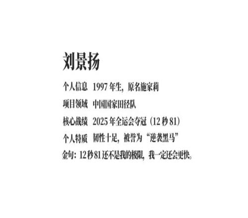 我们先来为本次的黑马刘景扬做一个单人页介绍~ 可以看到,这里整理出了她的基本信息,以及一句赛后金句,文案不算特别多。