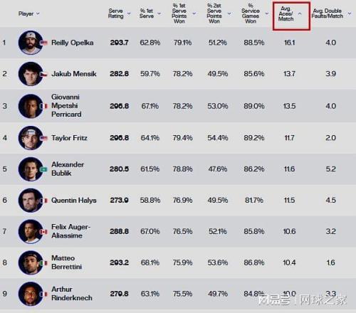 我们再来关注一项数据排行榜。在2025赛季ATP巡回赛的赛场上,哪位球员场均发出了最多的ACE球呢?答案是美国小巨人奥佩尔卡,他的这项数据是16.1个。排在第二位的是捷克人门希克的13.7个,法国小巨人佩里卡德以13.5个的微弱劣势排在第三位。排在第四至第十位的分别是弗里茨的11.7个、布勃利克的11.6个、哈里斯的11.5个、阿利亚西姆的10.6个、贝雷蒂尼的10.4个、林德克内希的10个和孟菲尔斯的9.9个。在TOP10中,法国人占据了四席,而阿卡和辛纳都没有上榜。是不是很意外呢?