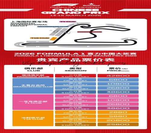 2026年3月13日至15日,作为新赛季第二站,2026F1喜力中国大奖赛将在上海国际赛车场拉响引擎。 12月5日,官方票价正式公布,票务销售将于12月11日上午11时正式开启。观众可通过下载官方票务渠道久事体育APP,或登录“久事体育APP”微信小程序及支付宝小程序提前做好抢票准备。海外车迷则可通过久事体育APP国际站进行在线选购。