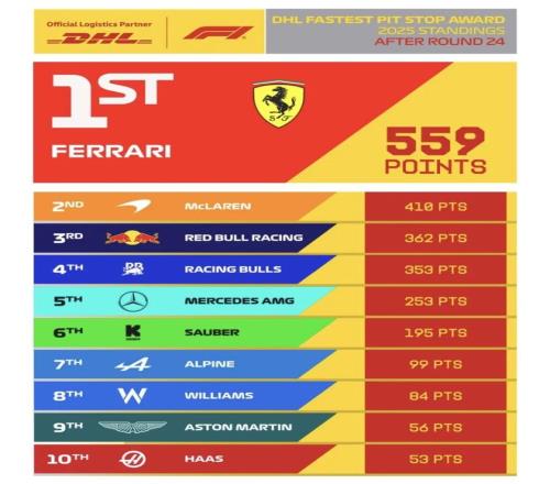 随着诺里斯成功登顶WDC,围场内已经开始了对于2026赛季的准备。不过北京时间今天,围场内一股红色旋风在本赛季F1结束之后,刷屏了各位车迷的手机!就在北京时间今天凌晨,F1官方社交媒体公布了本赛季最快换胎奖的得主,冠军竟然是——法拉利车队!