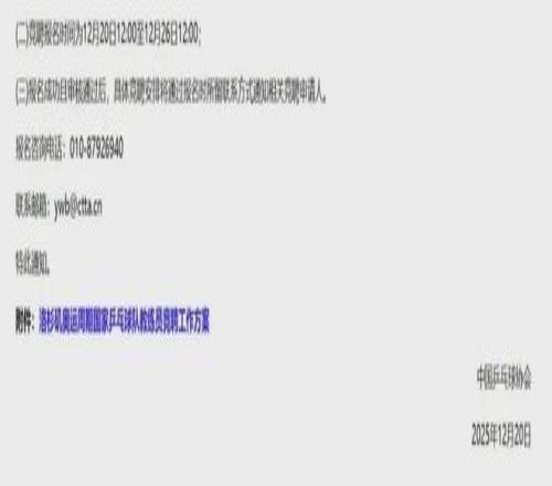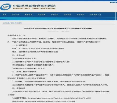 “乒乓世界”消息,中国乒乓球协会官网于12月20日正式发布《中国乒乓球协会关于举行洛杉矶奥运周期国家乒乓球队教练员竞聘的通知》,正式启动新周期国家队教练员公开竞聘工作。 本次竞聘工作于2025年12月29日至31日在国家体育总局训练局乒乓球馆举行。在岗位设置上,本次竞聘紧密围绕洛杉矶奥运会的实战需求与队伍长远建设进行科学规划。除总教练岗位外,增设副总教练岗位,并对各教练岗位的职责与能力标准提出了更为清晰和更高的要求,突出强调先进的训练理念、卓越的临场指挥能力、技术创新意识以及培养青年后备力量的综合素养。 据悉,中国乒协成立专项工作小组,研究制定《洛杉矶奥运周期国家乒乓球队教练员竞聘工作方案》,严格按照程序报经上级组织审批后执行。 竞聘工作将通过公开报名、资格审核、竞聘陈述和答辩、评审委员会无记名投票以及最终结果公示等环节,产生总教练1人、副总教练1人、国家队男女队主教练各1人、国家青年队男女队主教练各1人、国家队教练员12人、国家青年队教练员10人。 评审委员会由中国乒协有关负责人、乒乓球项目专家、乒乓球项目科研人员代表、优秀运动员代表共同组成。国家体育总局乒乓球羽毛球运动管理中心党委派人对本次竞聘工作进行监督,确保竞聘工作严肃性、合规性与权威性。 中国乒协表示,期待通过此次公开竞聘,进一步优化国家乒乓球队教练员队伍结构,选拔出能够引领国家队再创奥运辉煌的优秀教练队伍,同时也为全国乒乓球教练人才提供一个展示与交流的高规格平台,共同巩固中国乒乓球的人才根基。 |