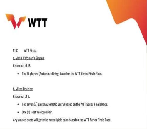 2026年WTT总决赛赛期增加一天,混双改为单败淘汰制